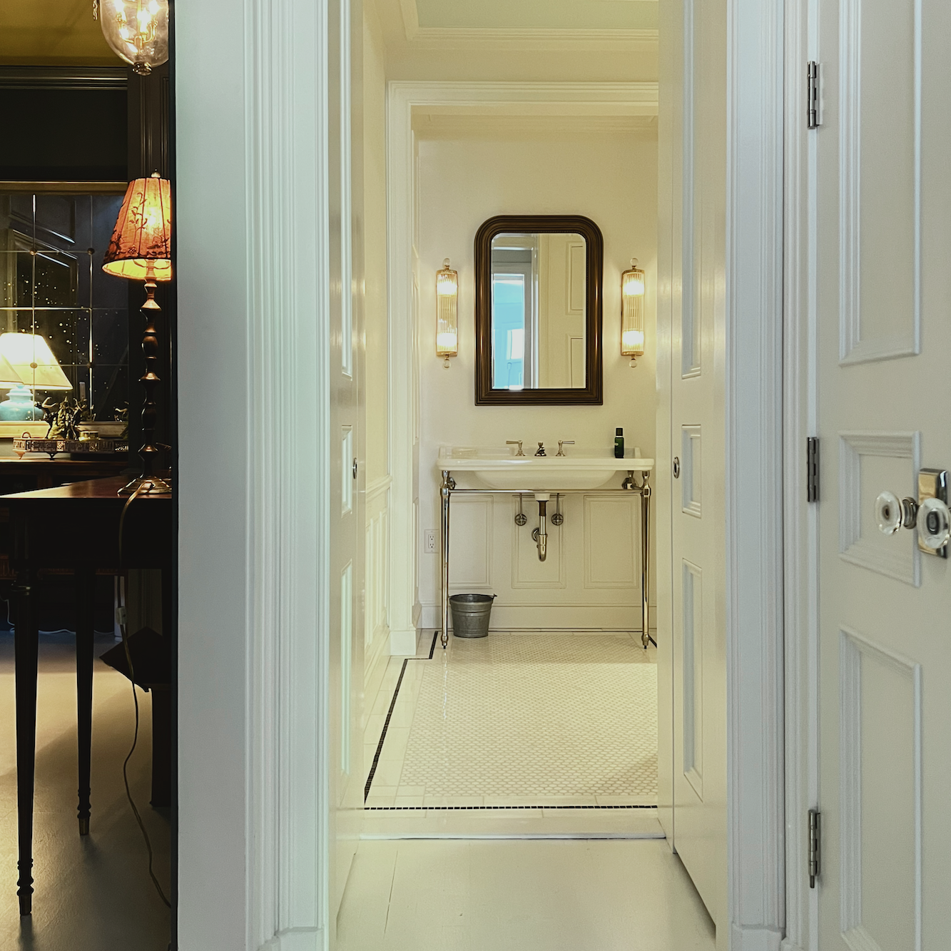 The renovations are designed to bring back all that was lost over the years of horrid remuddling and neglect. It was because of them that I knew to make my mantel mirror go almost to the ends of the mantel. You might also enjoy this post when I took two of their empty rooms and furnished them.